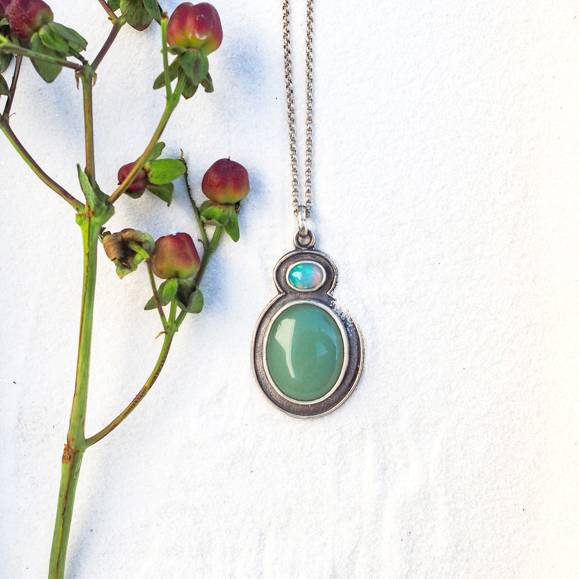 A fire-filled opal with green highlights teams up with a luscious chrysoprase cabochon, a stone often called Australian Jade. Capturing the enlivening energies of green, a synergy sure to enhance your spirits.